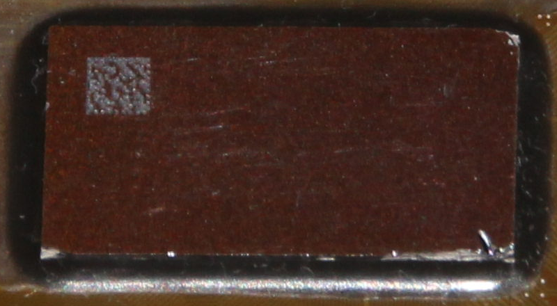 Nach einem Blick durch die 6× Lupe offenbarte sich das Elend. Da hat sich am Die wohl mal was verabschiedet. Da der Prozessor seinerzeit in funktionsfähigem Zustand eingelagert wurde, könnte das also durchaus beim Einschalten passiert sein, auch wenn sensorisch dabei nix wahrnehmbar war. Nachfolgend zwei Bilder, der erste mit "Makrofunktion" (ca. 40 cm Abstand, 250 mm Brennweite, APS-C-Sensor) der DSLR, das zweite als Ausschnittsvergrößerung vom ersten.