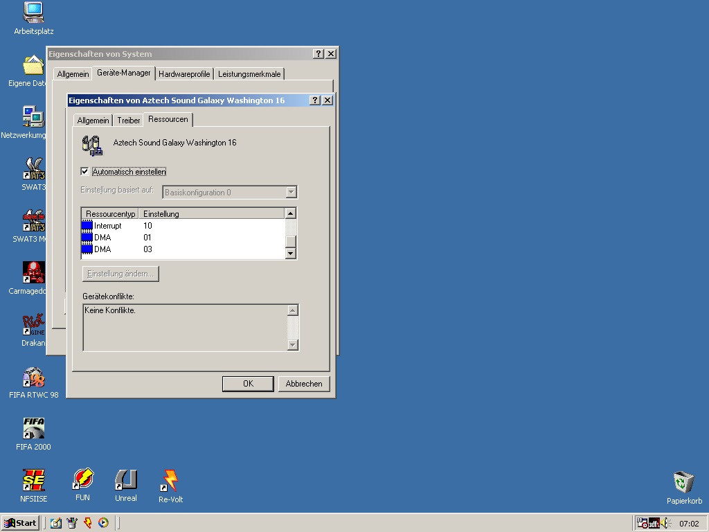 Die Treiber brauchen jetzt freie Ressourcen. Sagen wir 220 hex, IRQ 5 und DmA 1. Alte Karten müssen auf so etwas gejumpert werden, Plug & Play suchen sich selbst freie. Sie dürfen nicht doppelt belegt werden. Letztendlich müssen die Werte im Treiber mit denen im Spiel übereinstimmen. egal welche es sind, aber mit den Standards geht man sicher, dass diese überhaupt im Spiel auftauchen. ein 8 Bit Erweiterungskartentreiber wird kein IRQ über 8 unterkommen. Daher eher ungünstig.