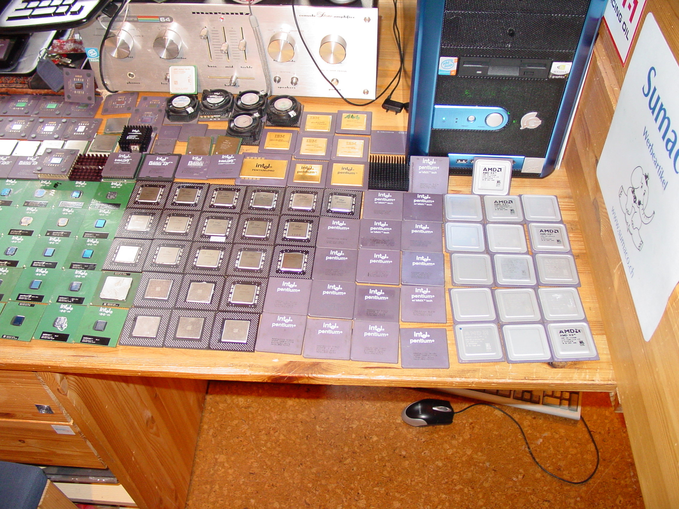Die aufm Bild sind 202 Stück, dazu kommen noch ca. 6 486er die verbauen sind auf Boards, ein Sockel 423 Pentium 4, n Amd 486 133 Mhz n AMD 386 DX 40, diverse Pentium 4 sowie 2-3 Sockel A Athlons :D Achja, ca 15 AMD Slot A und Pentium 2-3 Slot 1 liegen auch noch rum :D