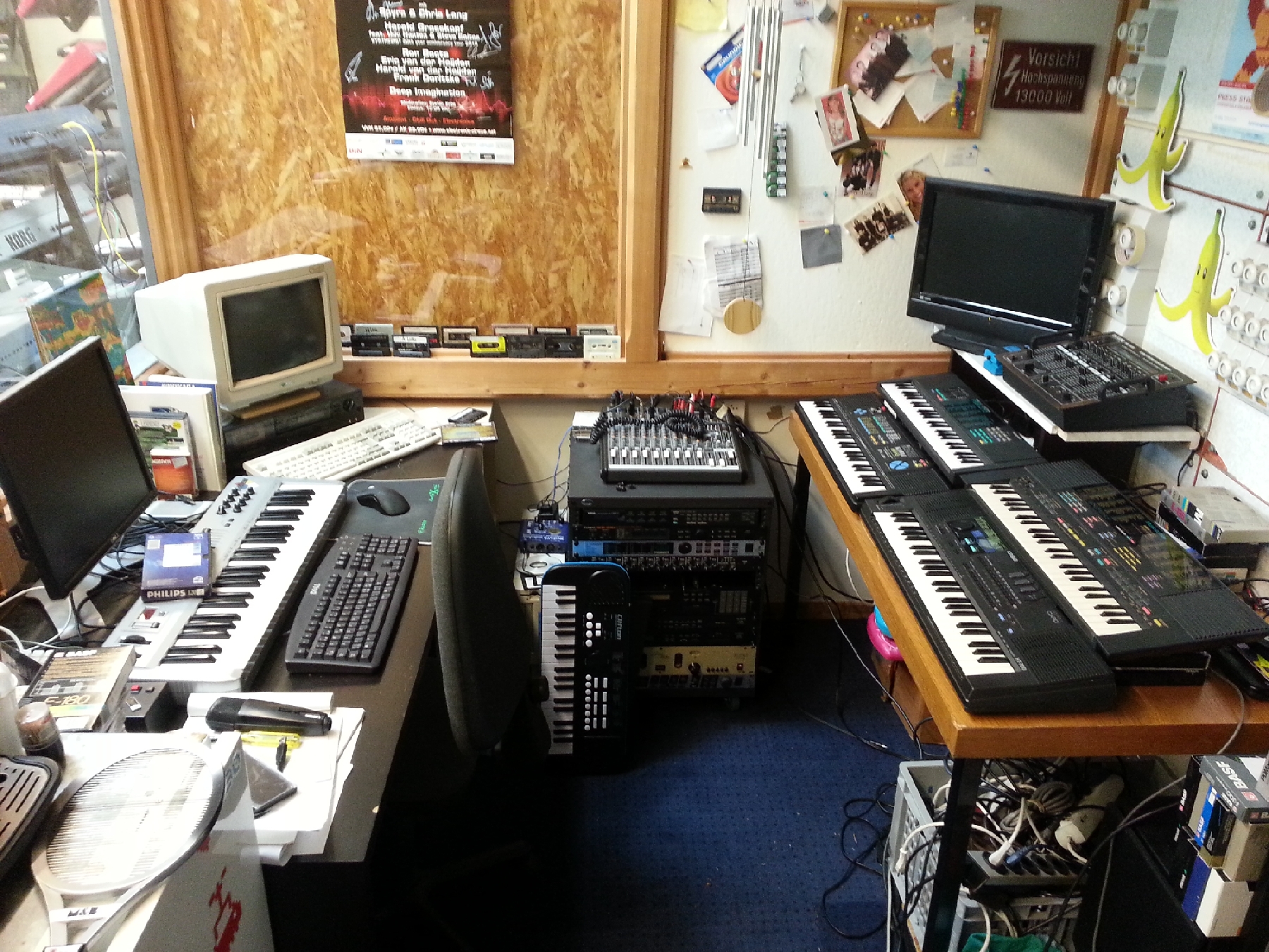 Das Nebenprojekt-Studio... wollte da eigentlich mal so Amiga-Style/Soundblaster Musik machen, komme aber nicht dazu. Hier sample ich auch alle Instrumente, digitalisiere VHS und Kassetten und Vinyls. Und das alles mit einem ollen P4.