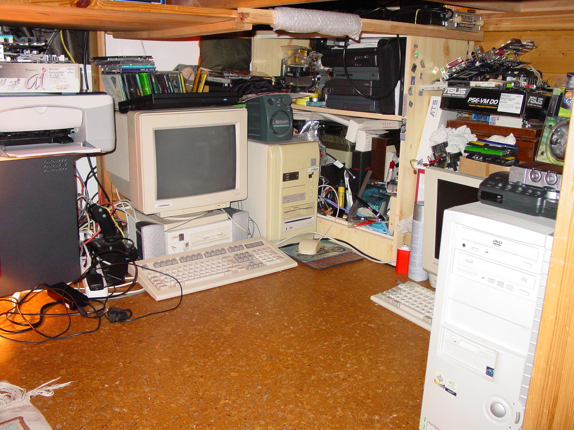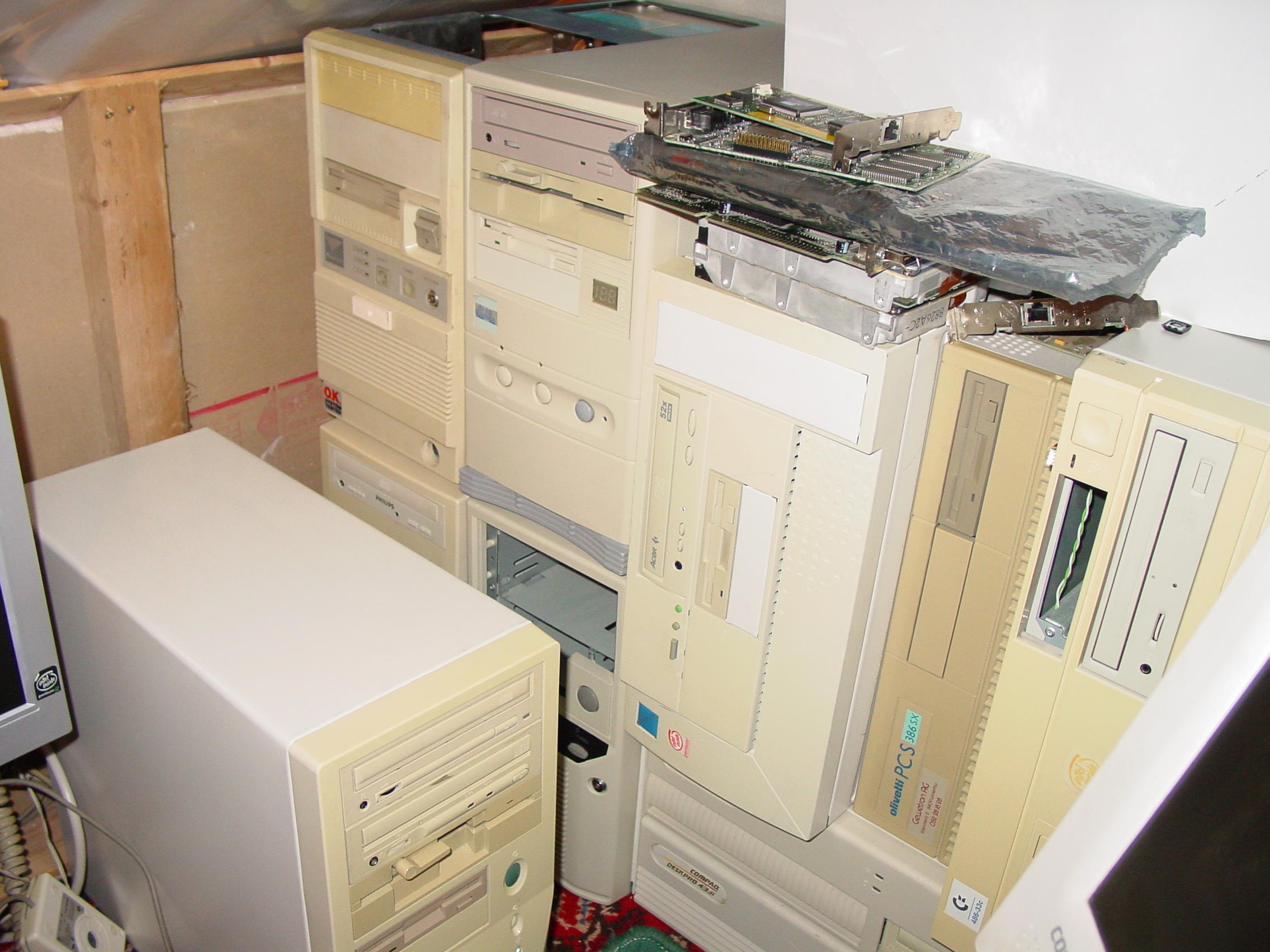 Ich Probiere Ordnung zu behalten und defektes wegzuschmeissen aber naja ihr sehts ja selber, ich habe ne Faible für die Mini AT Tower mit den Zahlen für Mhz darum sinds so viele zudem auch noch n Nagelneuer 486er Big Tower mit Windows 3.11 druff, den kleinen Acer Pc mit integriertem Flachbildschirm, n Comodore 486 2 Compaq 486 und n AST Pentium 200 und eienen Olivetti 386er.