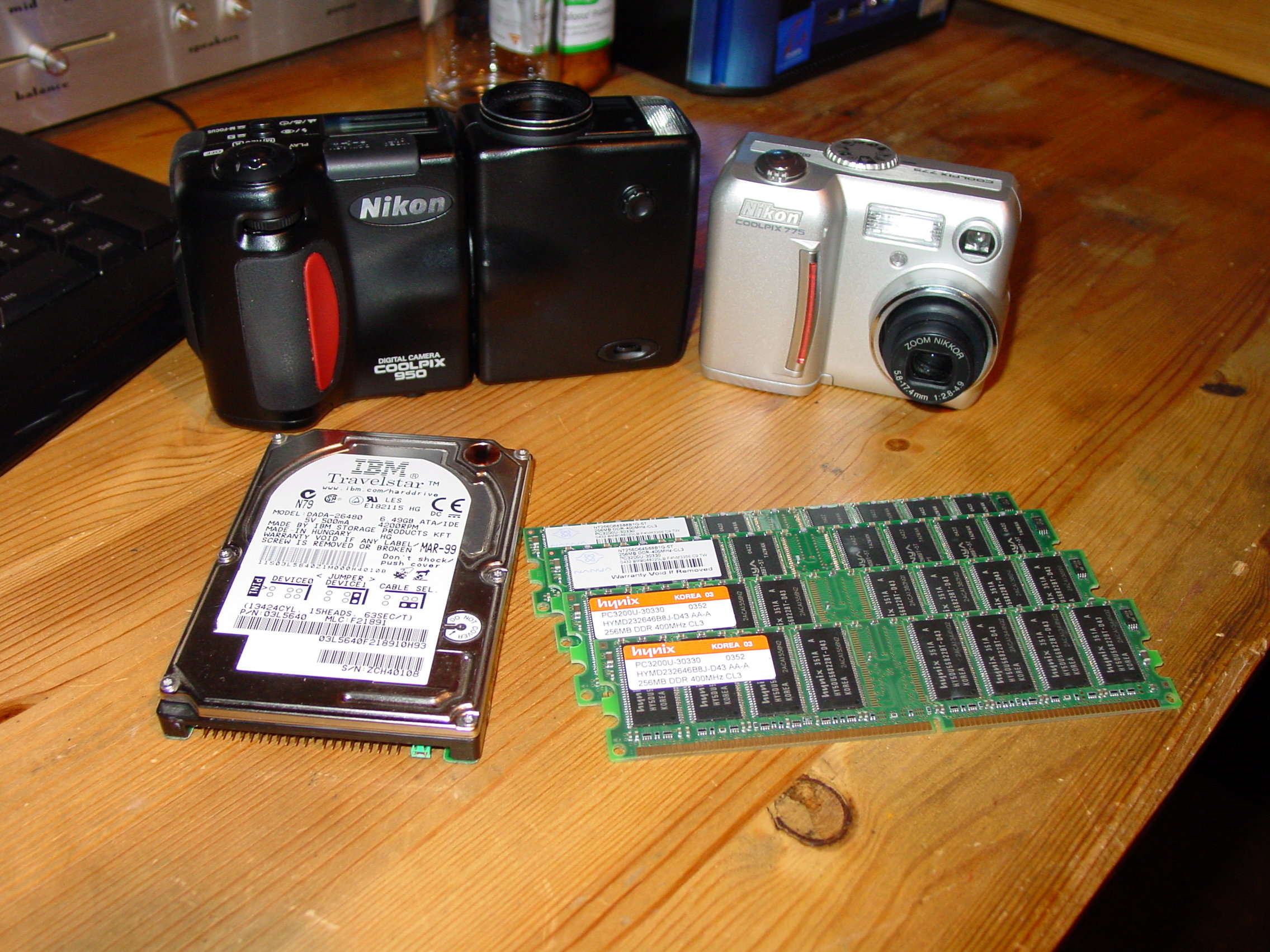 2 Digicams von Nikon Coolpix 775 und 950 sowie ne 6,4 gb IBM Notebook HDD und 4x DDR1 PC 3200 Rams a 256 MB und n Pentium 4 2,8 ghz 512 MB Cache und 800 Mhz FSB.