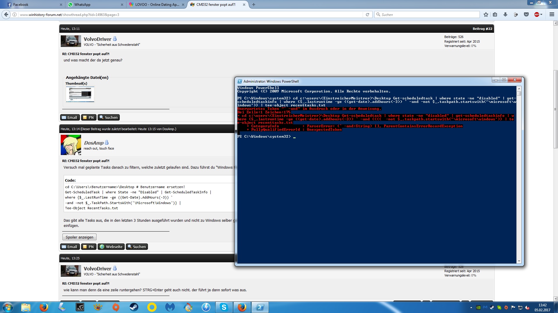 Codecd C:\Users\<Benutzername>\Desktop # Benutzername ersetzen! Get-ScheduledTask | where State -ne "Disabled" | Get-ScheduledTaskInfo | where {$_.LastRunTime -ge ((Get-Date).AddHours(-3)) ` -and -not $_.TaskPath.StartsWith('\Microsoft\Windows')} | Tee-Object RecentTasks.txtDas gibt alle Tasks aus, die in den letzten 3 Stunden ausgeführt wurden und nicht zu Windows selber gehören (die sollten wahrscheinlich nicht schuld sein) und schreibt diese zusätzlich in eine Datei "RecentTasks.txt" zum Hochladen / in [code]-Tag einfügen.