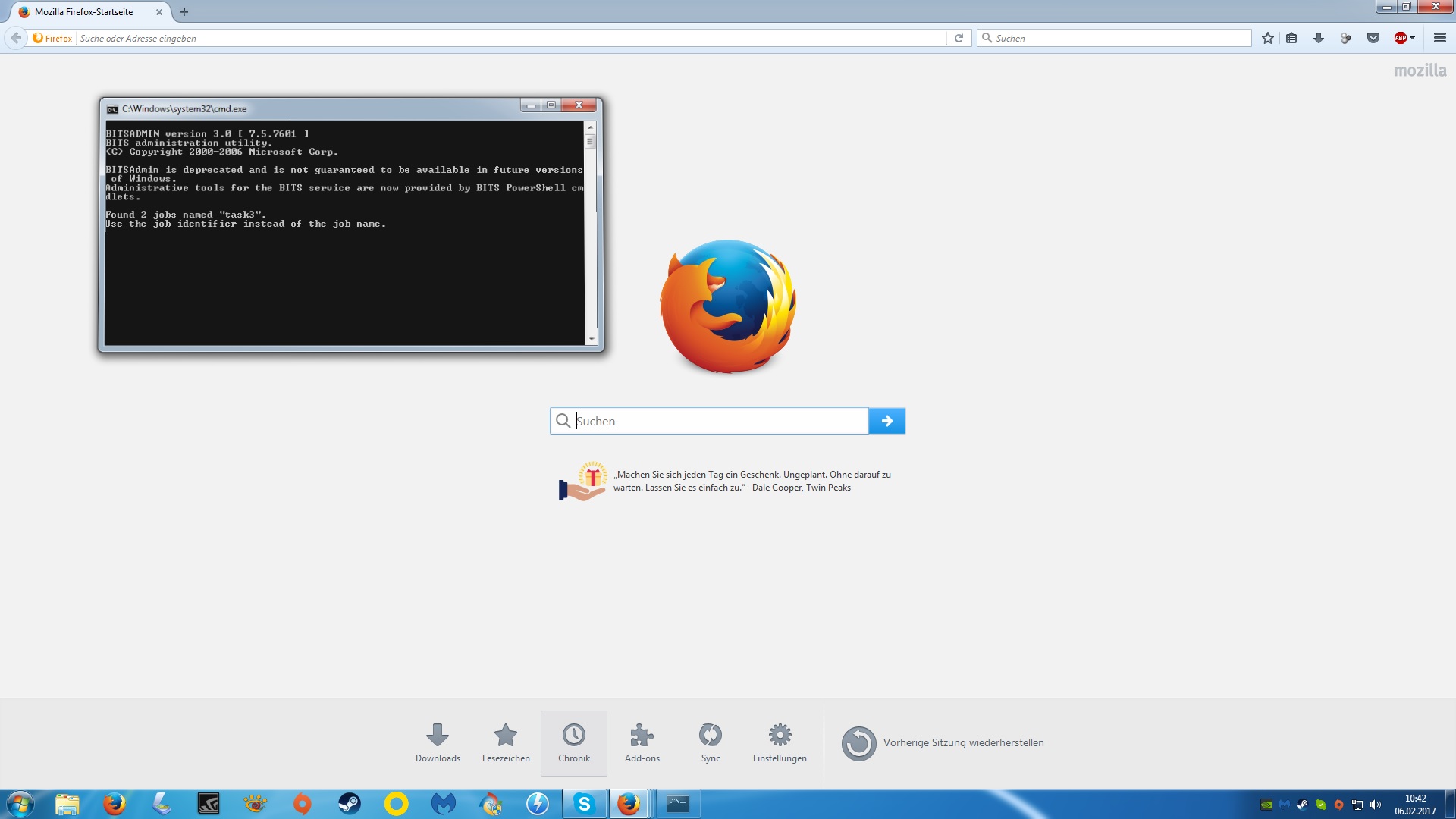 https://www.bleepingcomputer.com/forums/t/63448…osing-randomly/Das sieht noch danach aus, als ob da noch etwas Schädliches übrig ist. In der Regel wurde bitsadmin von einem VBScript namens task.vbs angestoßen (daher auch mehrere Konsolenfenster), aber bei dir wohl von einer Batchdatei (daher das cmd-Fenster). Ich würde generell noch mal empfehlen, Temp File Cleaner sowie ADWcleaner im abgesicherten Modus auszuführen.