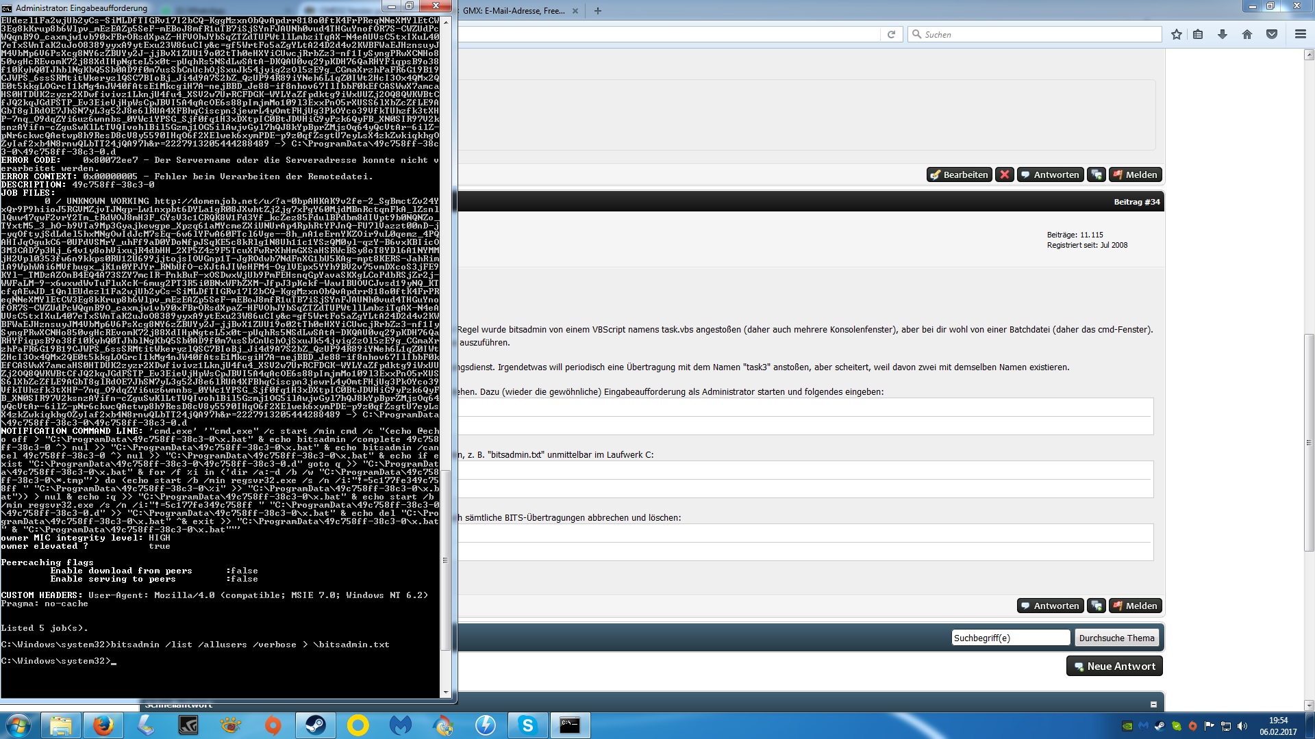 Wenn das mehrere Seiten Ausgabe ergibt, kann man das in eine Datei umleiten, z. B. "bitsadmin.txt" unmittelbar im Laufwerk C:, die du hier im Forum als Anhang anhängen kannst: