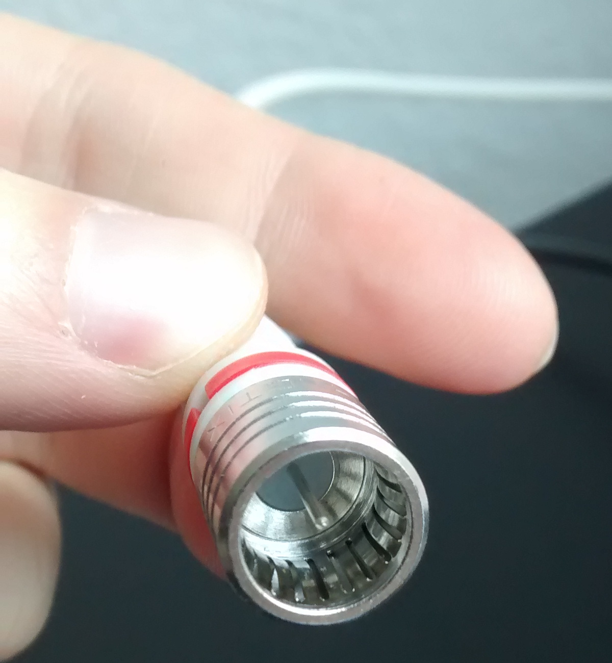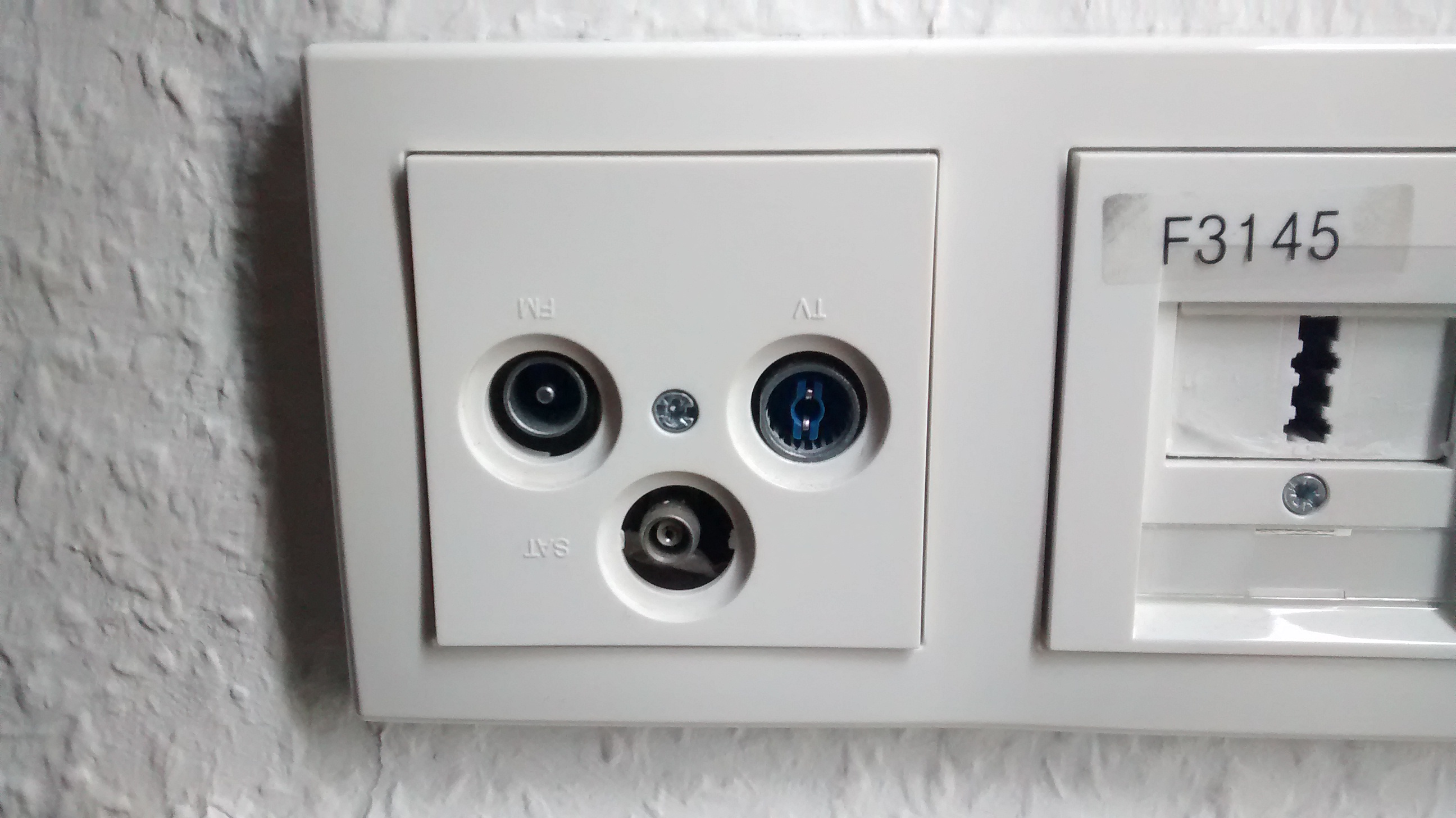 Jetzt les ich in der Installationsanleitung der Fritzbox, dass ich die an die "Multimediadose" anschließen soll, die wohl die Stecker "Data", "TV" und "Radio" hat. Ich hab hier allerdings eine Dose mit "SAT", "TV" und "Radio" (die übrigens auf dem Kopf steht). Das Kabel passt zwar an den SAT Anschluss, ist allerdings nicht so fest. Die Anleitung deutet eher darauf hin, dass man das Kabel eher anschrauben sollte, mit nem Gewinde wie am Router. Ich hab mal Bilder von der Dose (plus Nahaufnahme vom SAT-Anschluss) und dem beiliegenden Kabel gemacht. Ist das der richtige Anschluss, oder wie soll das jetzt funktionieren?