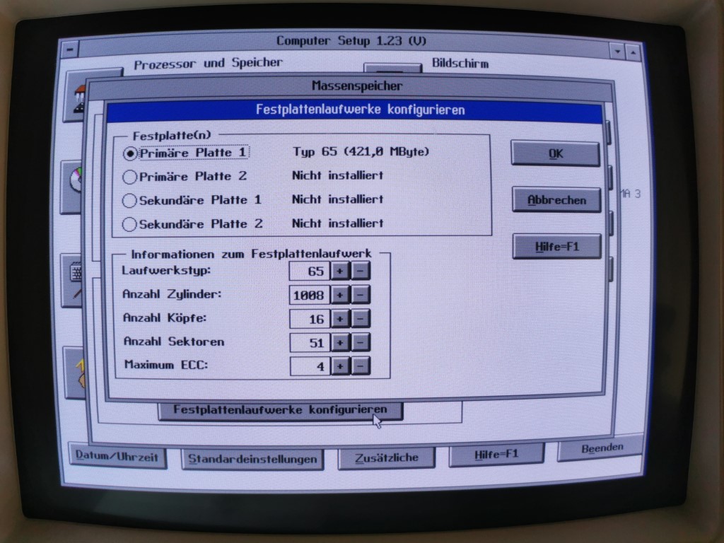 Laut Handbuch sollen User-Festplatten unter der Nummer 65 eingetragen werden. Ich habe die Originale drin, deshalb weiß ich nicht, ob nicht aufgeführte Platten funktionieren. Es soll ja aber bis 1GB funktionieren.