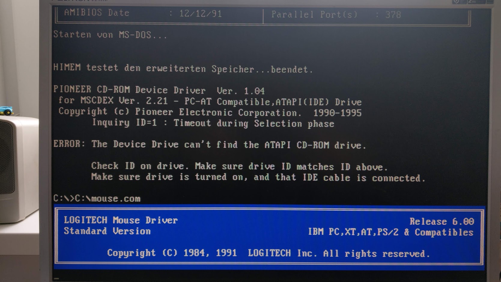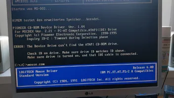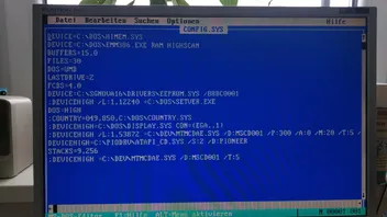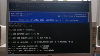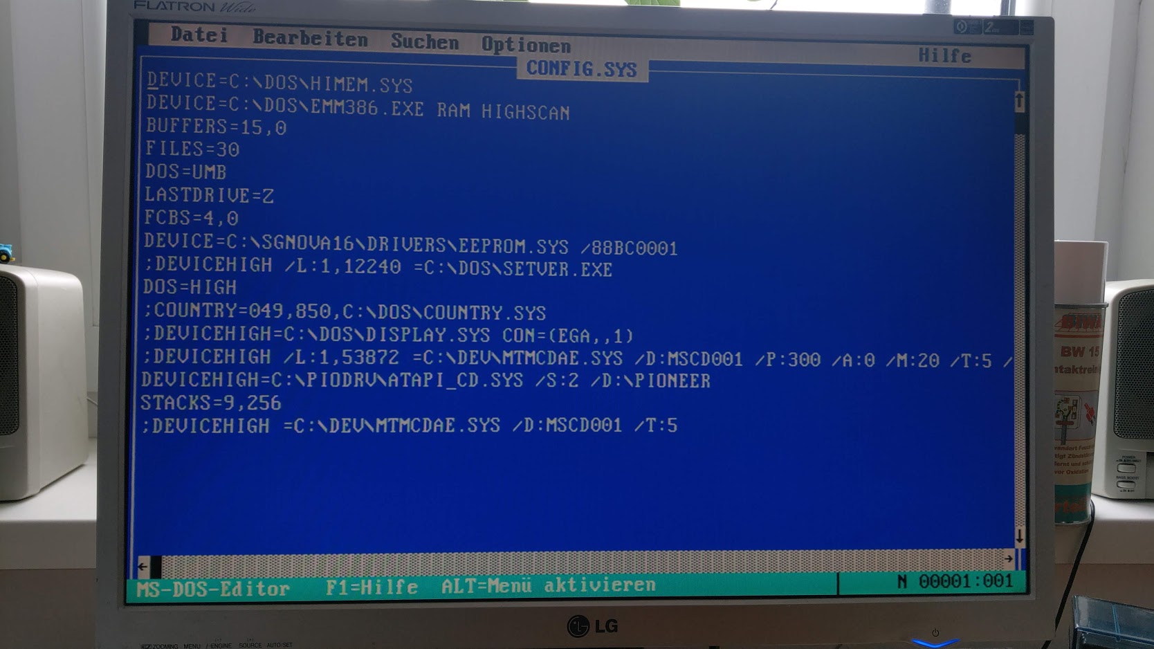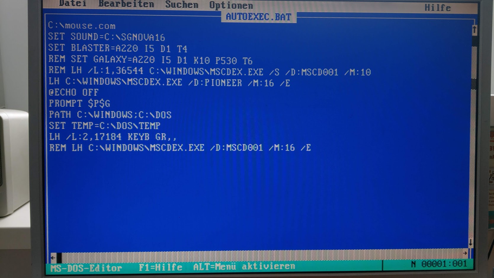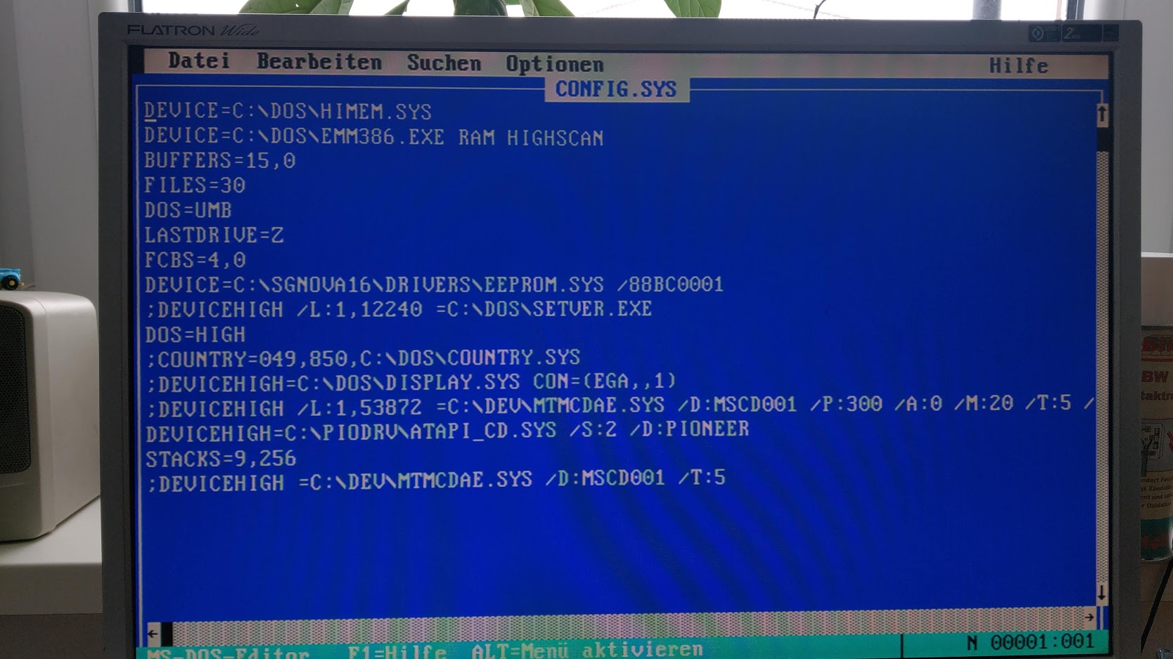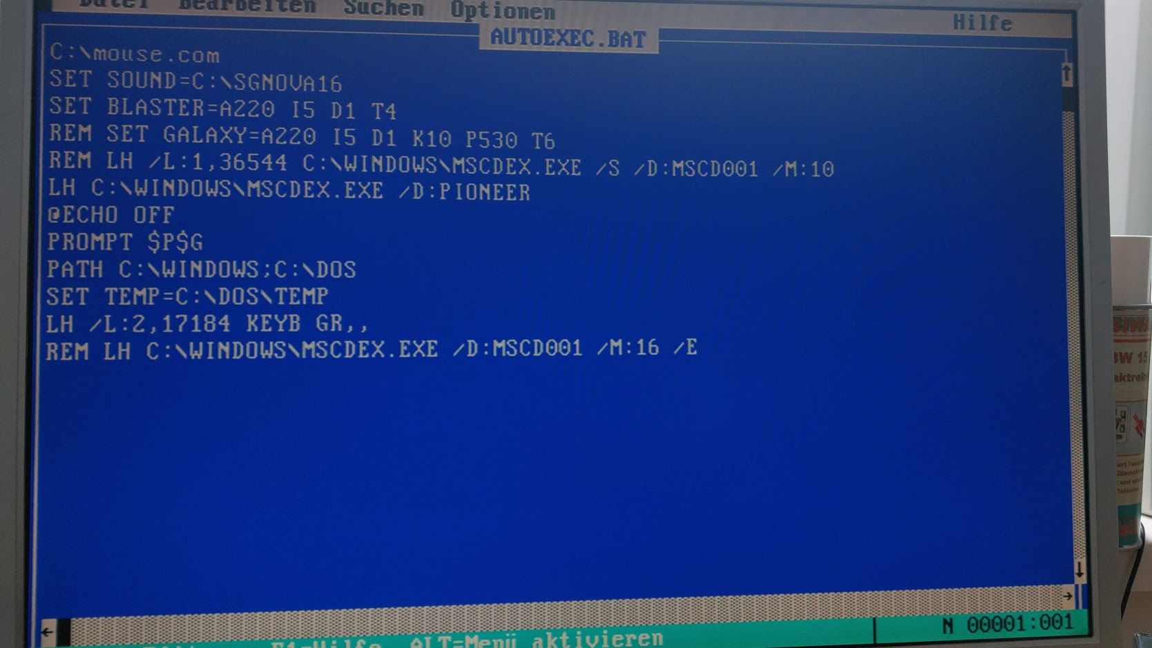 In Deiner config.sys steht auskommentiert etwas von MTMCDAE.SYS, der zu proprietären Mitsumi-CD-ROM-Laufwerken (z.B. LU005 samt Controller-Karte) gehört. An so einer "Mitsumi CD-ROM DRIVE 16BIT
