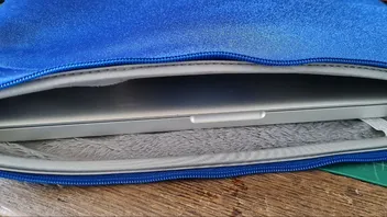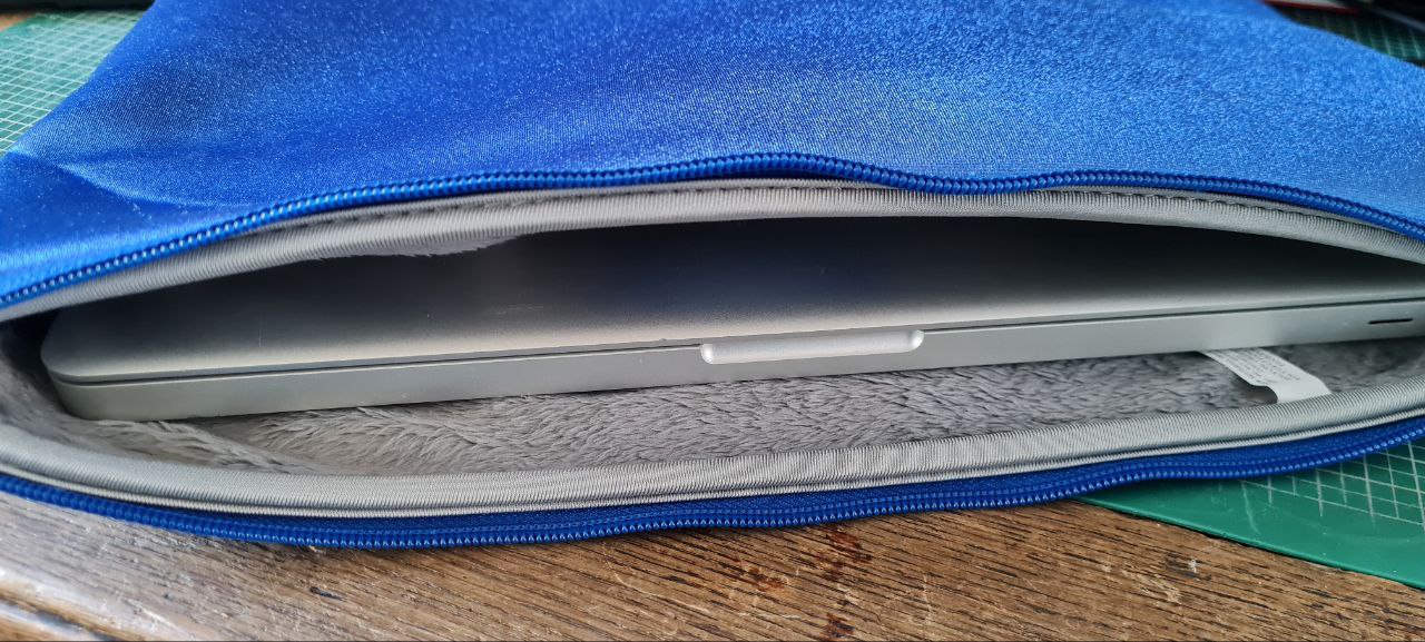 Dabei ist das Netzteil und eine schöne, gefüttterte blaue Notebookneoprentasche.