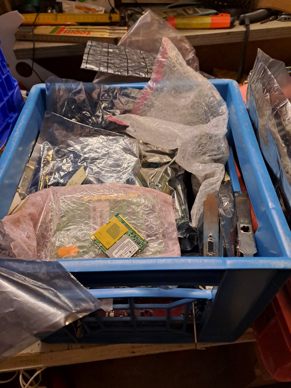 Ne Kiste voller Karten. Das meiste sollten Grafikkarten sein. PCI, AGP. Teuer gekaufte sinnlos angesammelte. Dazu Controller, NIC