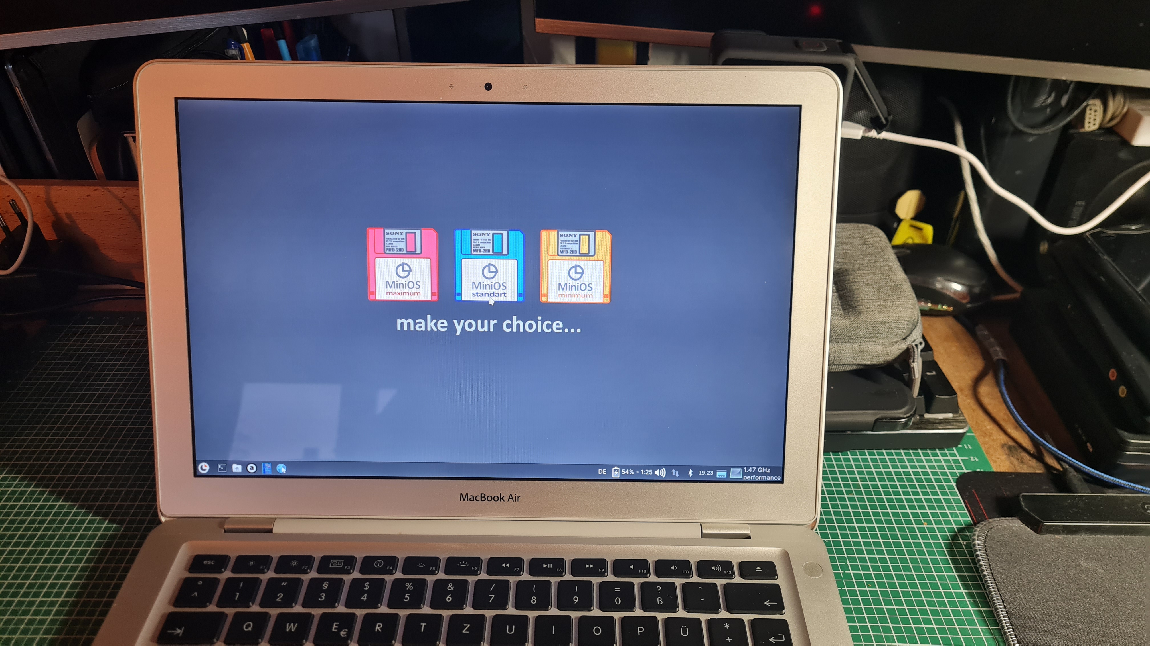 Derzeit ist MiniOS (Debian) installiert was recht flink läuft. Auf dem Deckel hat es bei genauerem hinsehen zwei Kratzer, ansonsten kommt das Macbook sehr gepflegt daher. Das Display ist in Ordnung und hat keine Pixelfehler.