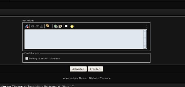 Wenn man darauf klickt: "View more results" und "Turn off Top Stats". Dann wie von HOMEBOY bereits genannt, das "Jump to first unread post in $Thread" und in der erweiterten Ansicht ist ebenfalls alles Englisch.Dann ist im Black-Style das Eingabeeld des Editor im Textmodus (also nicht WYSIWYG) total weiss. Beziehungsweise allgemein sind Eingabefelder (<input type="text"> und <textarea>) alle weiss. Dafür dürften die Benutzerangaben links von den Beiträgen etwas heller sein, jedenfalls versinkt mein Avatar in all dem Schwarz.