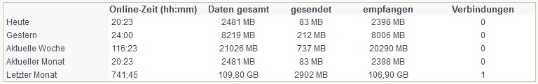 Alles anzeigenppp0 / monthly month rx | tx | total | avg. rate ------------------------+-------------+-------------+--------------- Dez '12 179,93 GiB | 9,74 GiB | 189,67 GiB | 594,03 kbit/s Jan '13 111,28 GiB | 9,26 GiB | 120,55 GiB | 377,54 kbit/s Feb '13 516,20 GiB | 32,97 GiB | 549,17 GiB | 1,90 Mbit/s Mär '13 197,06 GiB | 15,02 GiB | 212,08 GiB | 664,21 kbit/s Apr '13 257,06 GiB | 30,94 GiB | 287,99 GiB | 932,05 kbit/s Mai '13 230,08 GiB | 20,34 GiB | 250,41 GiB | 784,28 kbit/s Jun '13 295,48 GiB | 10,05 GiB | 305,53 GiB | 988,82 kbit/s Jul '13 71,71 GiB | 25,51 GiB | 97,22 GiB | 304,48 kbit/s Aug '13 156,92 GiB | 29,28 GiB | 186,20 GiB | 583,18 kbit/s Sep '13 157,35 GiB | 15,04 GiB | 172,38 GiB | 557,90 kbit/s Okt '13 106,32 GiB | 37,52 GiB | 143,83 GiB | 450,48 kbit/s Nov '13 1,20 GiB | 3,94 GiB | 5,15 GiB | 348,37 kbit/s ------------------------+-------------+-------------+--------------- estimated 25,16 GiB | 82,46 GiB | 107,62 GiB | -