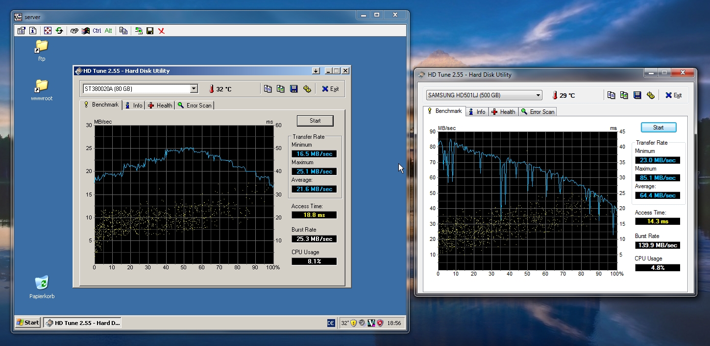 Ihr hab mir mal überlegt, das wir mal ein Plattenbenchmark Rekord machen können. Es gibt eine Bestenliste, mit einen kleinen Extra! Der Schlechteste ist zugleich auch der beste für die Tiefenrekorde. Also sind auch langsame Platten gerne gefragt. Es wird zwischen Notebook und Desktop/Server unterschieden. Es wird aber immer vom Maximalen Lesewert gerechnet. Kein Screenshot, kein Eintrag. Unter Windows nutzt ihr am besten HD Tune und nicht HDTach. RAMDisk ist nicht erlaubt.