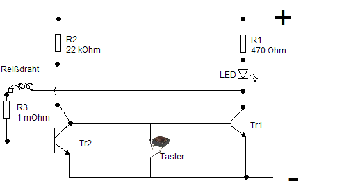 Deine Schaltung müsste also so aussehen, dass Tr 1 nur dann Strom auf die Basis bekommt, wenn der Draht geöffnet wurde. Bei deiner jetzigen Schaltung hast du ja einen Stromteiler. Der Strom durch R2 teilt sich auf in den Basisstrom von Tr 1 und den Kollektorstrom von Tr 2.
