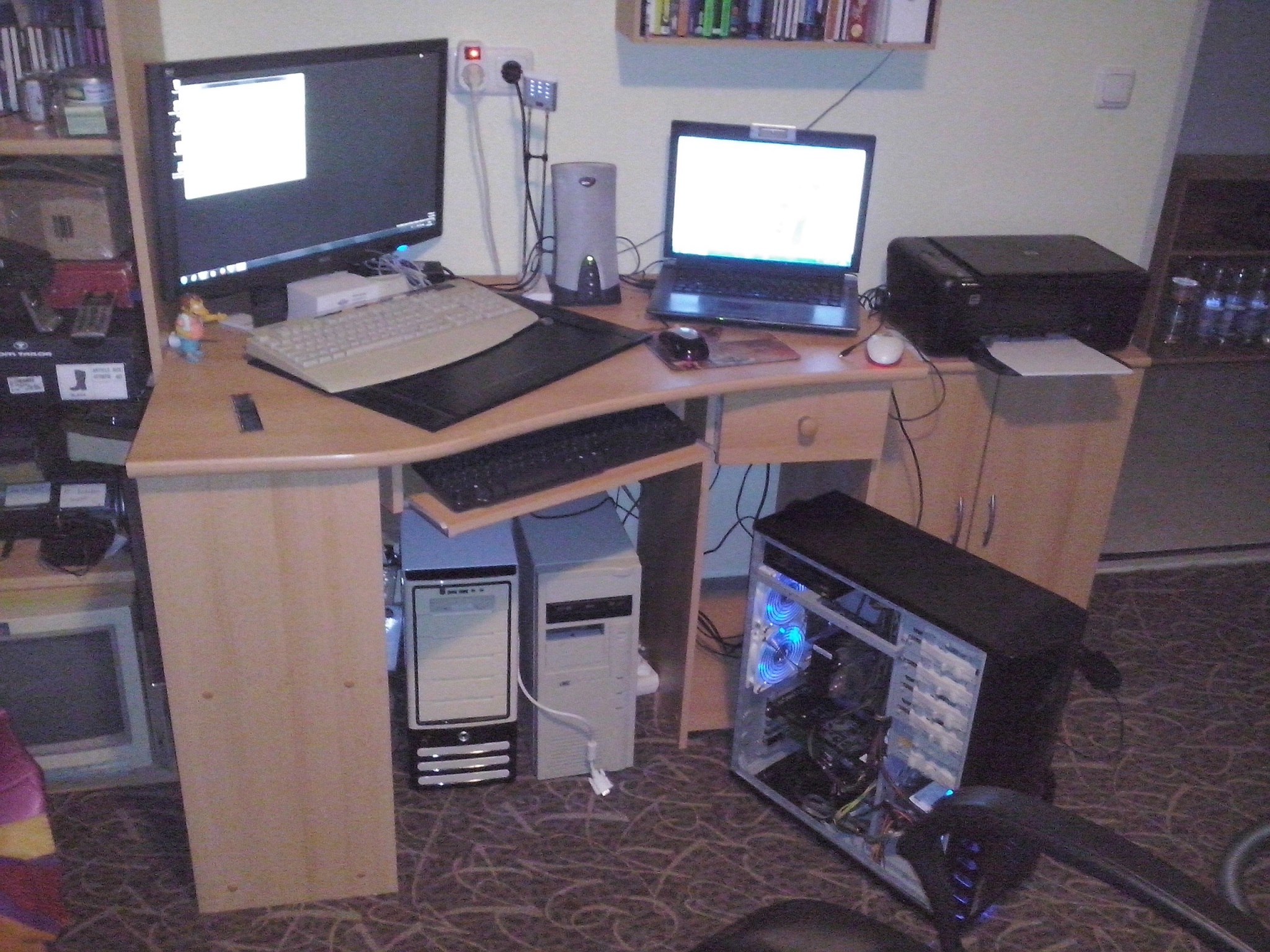 • Ich bin ja nicht immer unten und die Rechner laufen ja auch nicht permanent. Das unterm Schreibtisch sind 1 Leergehäuse und 1 Rechner de rnicht geht, der PB wird momentan eingerichtet, aber ich hör jetzt auf. Der Laptop ist dauerhaft unten stationiert wegen Internet, ausserdem weil das 1 Scharnier ausgebrochen ist.