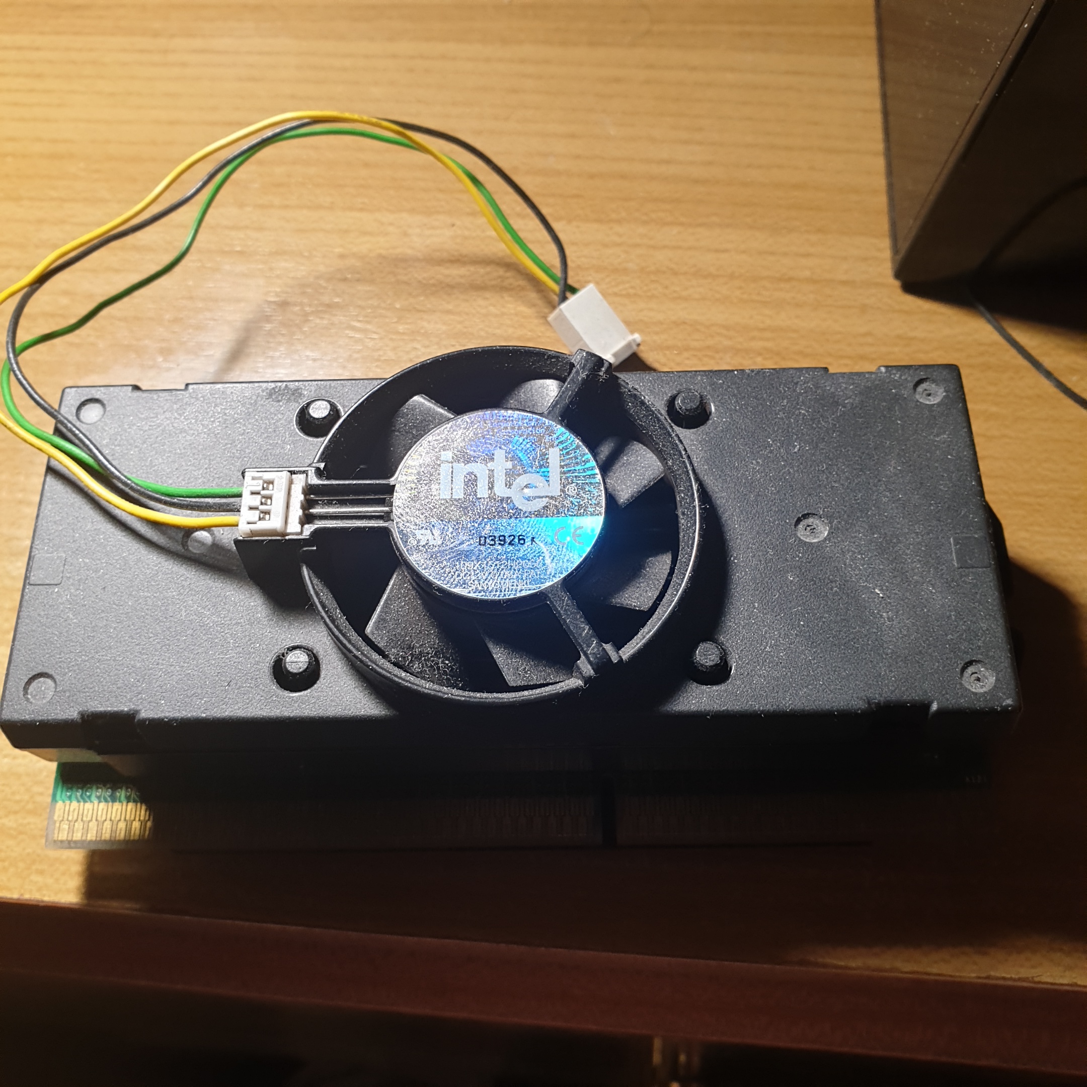 • Das mit den Lüftern stimmt... Hab hier nen Pentium 2 im SECC-2-Gewand. Der hat nen schwarz-eloxierten Kühlkörper fest verbaut und oben drauf n Aufschnappkonstrukt an Lüfter, auf dem n Intel-Hologramm-Aufkleber prangt.
