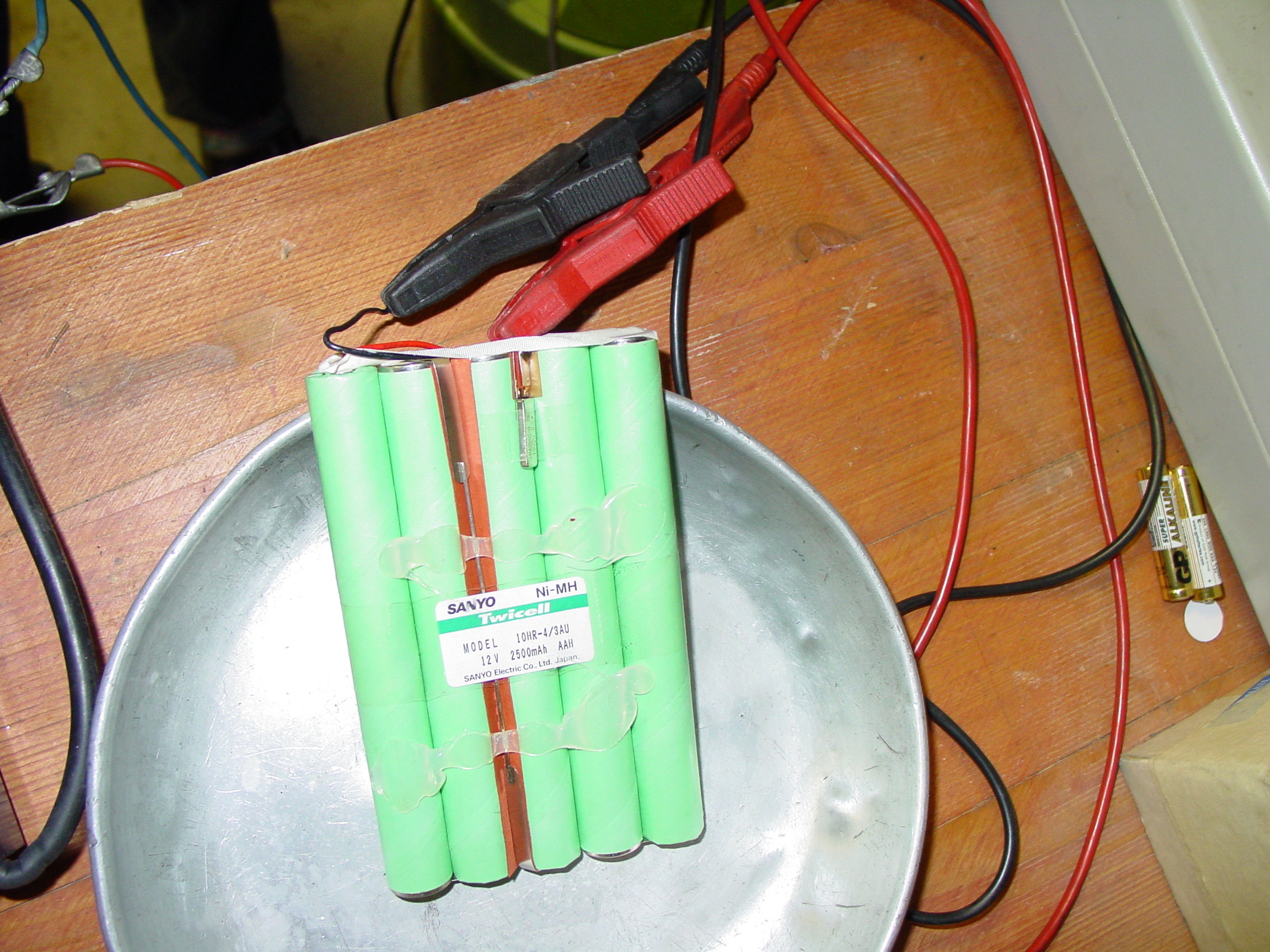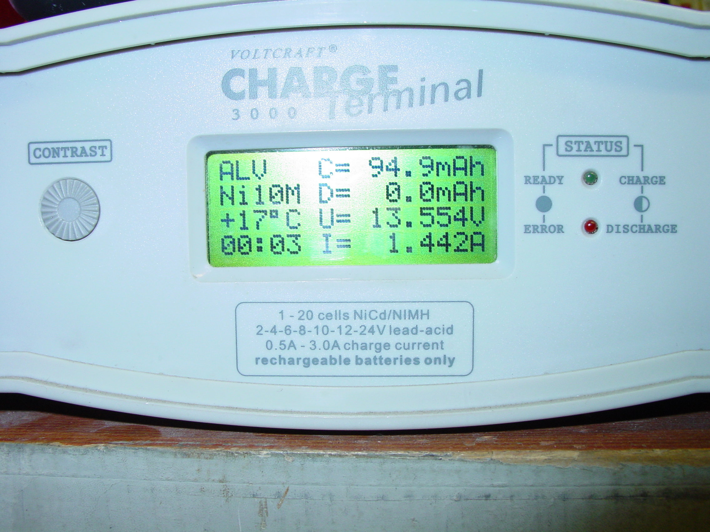 Vor mir liegen nun 10 Zellen von Sanyo mit 2500mAh die nach dem ich sie von der Elektronik abgelötet habe noch genau 1.3 Volt im Verbund zeigten. (12 Volt müssten es sein) Also kurzerhand an den Mutlilader gehängt und volle Lotte mit 1.5A Ladespannung drauf los. Dank dem Display hab ich dann gesehen, das innert 3 Minuten die Spannung wieder bei vollen 12 Volt war (und nun sogar ein wenig mehr), die Akkus nehmen den Strom gut auf und werden nur etwa Handwarm. Jetz lasse ich sie erstmal Laden, dann nochmals Entladen (warscheinlich mit ner 12V Autoglühlampe) und dann nochmals Laden.