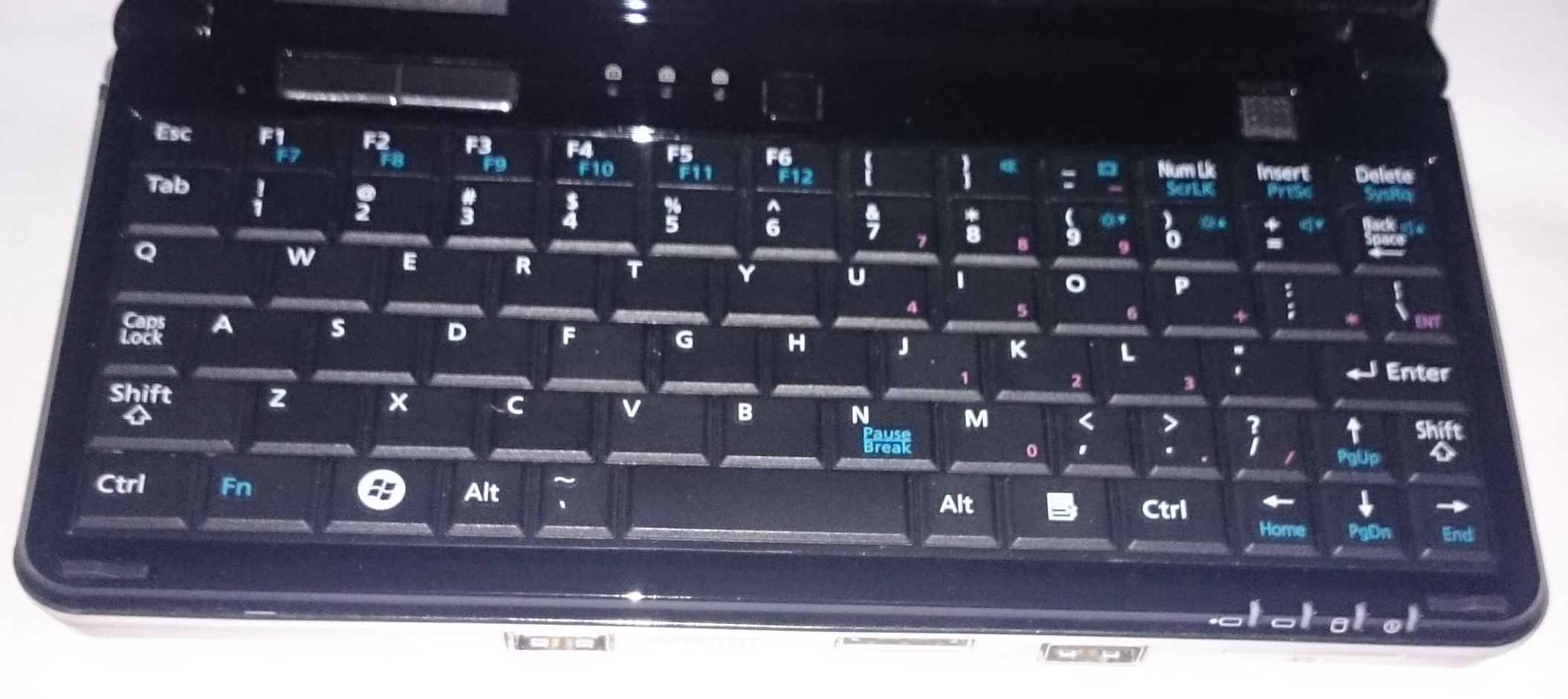- QWERTY-Tastatur (US-Layout), kleiner Trackstick mit linker und rechter Maustaste oberhalb der Tastatur
