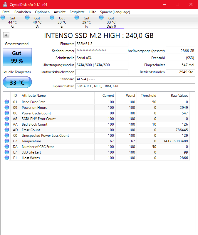 Intenso SSD M2 HIGH mit 240 ist kaum noch benutzbar und super langsam, dabei hat die nicht mal 3000 Betriebsstunden hinter sich und nur 2,8 TB geschrieben ...