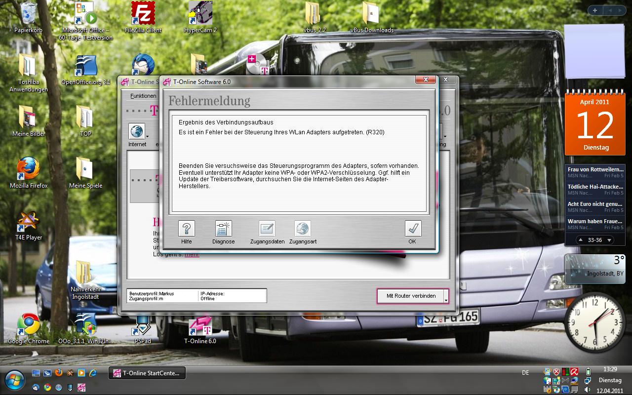 Bei Der T Onlline Software kommt nur eine Fehlermeldung und bei den normalen Internet Einstellungen nur Fehler.. verbind kann nicht hergestellt werden.