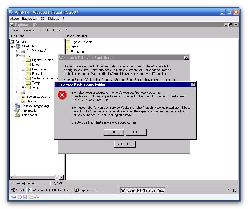 NT 4.0 SP6a: Installationsproblem bei System mit „hoher Verschlüsselung“? Wettwurst 26. August 2010 um 16:30 Heyho,So hab geplant,auf NT 4.0 SP6a zu installieren.Als,ich es versuchte,kam das raus:Was mache ich nun?